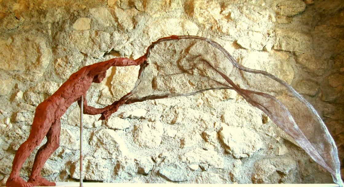 The net was made from tubular stainless steel and woven stainless steel netting. Graham Findlay, an accomplished sculptor in a variety of metals, who does all steel fabrication in my work, formed the shape of the net with me and did all the welding. To fix the netting to the "rope" required welds every 1/2 inch along a total length of some 20 feet. Quite a headache, as can be seen in the last picture of the followin gallery!